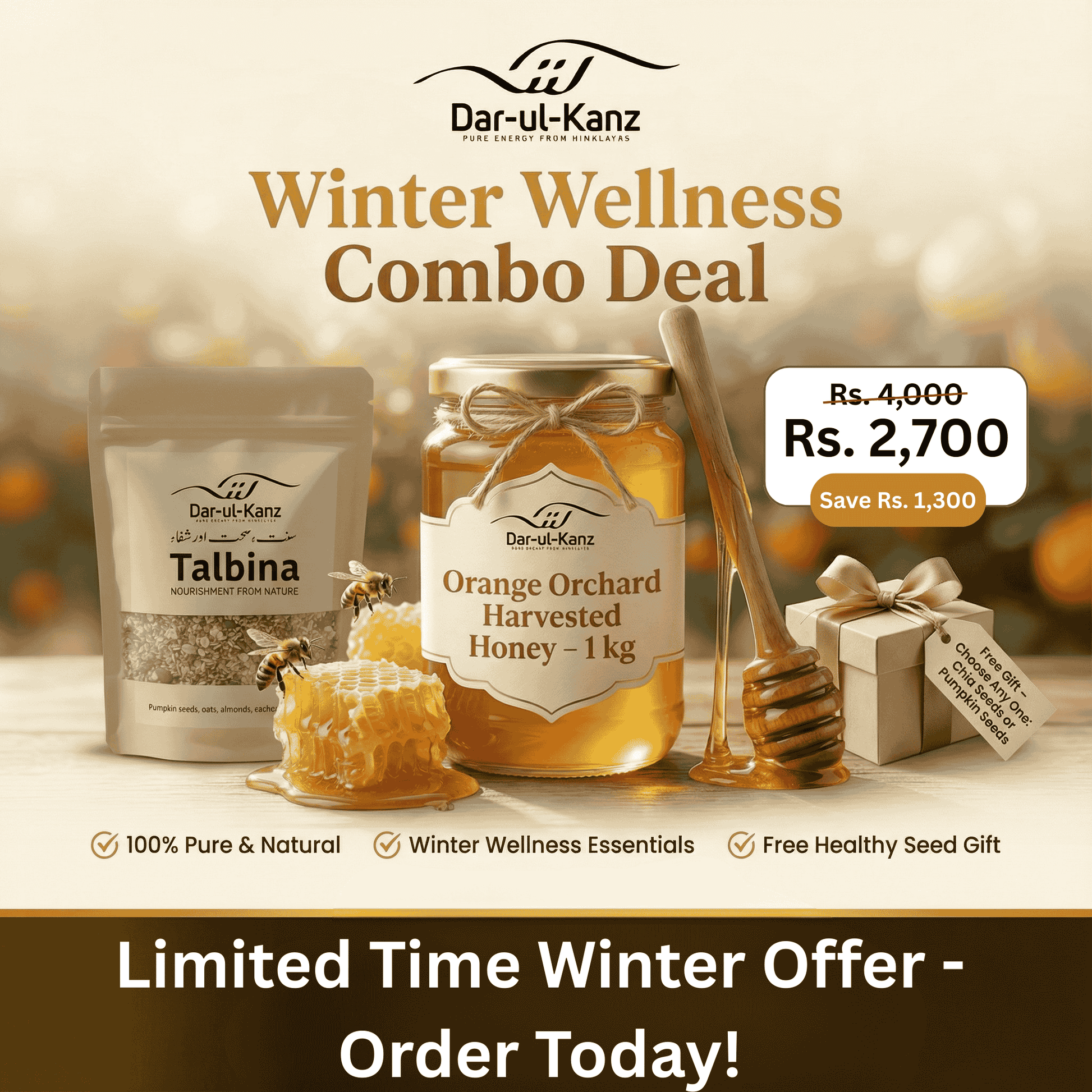 Give your body the care it deserves this winter with Darulkanz Winter Wellness Combo Deal — a powerful combination of pure honey, nourishing talbina, and a healthy seed gift, designed to support immunity, digestion, and daily energy.